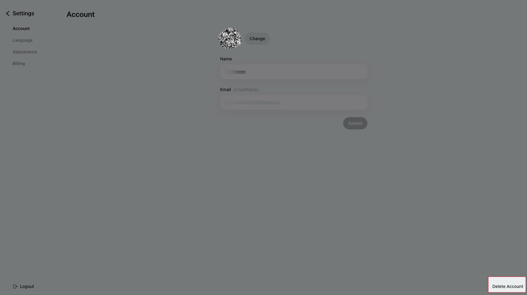 Click Delete Account in the bottom-right corner